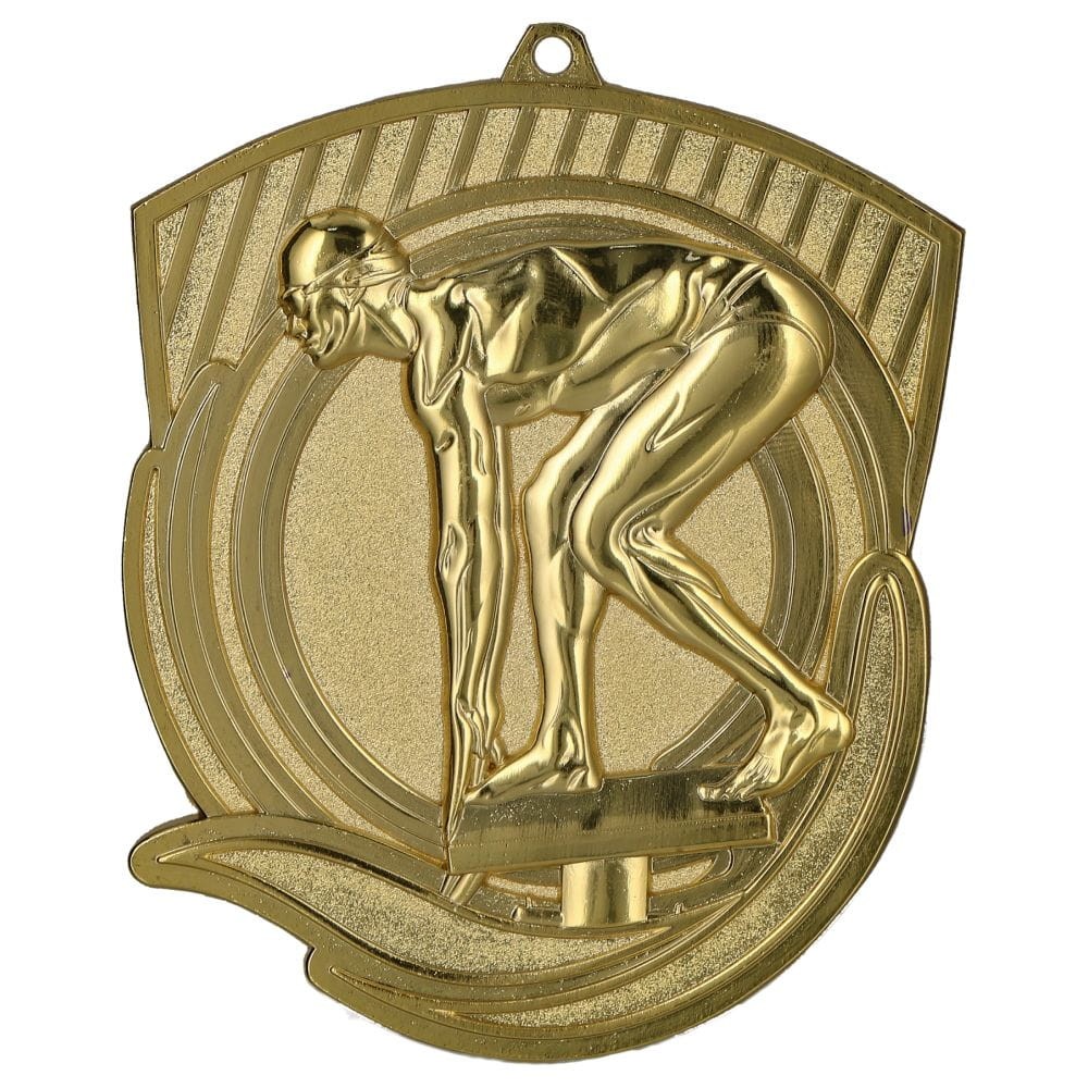 Prezentowany medal wykonany został ze znalu w kształcie tarczy, przedstawia pływaka w dynamicznej pozie tuż przed skokiem do wody. Precyzyjnie odwzorowane detale podkreślają sportowy charakter medalu, a jego klasyczna forma tarczy nadaje uniwersalny i estetyczny wygląd. Medal dostępny jest w trzech klasycznych wersjach kolorystycznych: złotej, srebrnej i brązowej, co pozwala dostosować go do rangi nagrody. Istnieje również dodatkowa opcja personalizacji medalu, umożliwiając dodanie dedykacji, logotypu lub innego symbolu, co uczyni go wyjątkowym upominkiem.