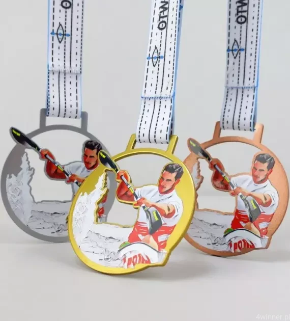 Prezentowany medal metalowy, wykonany został w technologii LaserCut, łączy on w sobie precyzyjnie wyciętą ażurową formę z trwałym, kolorowym nadrukiem, tworząc wyjątkowe wyróżnienie dla uczestników zawodów kajakarskich. Dynamiczny wizerunek kajakarza uchwyconego w trakcie wiosłowania symbolizuje siłę, koncentrację i nieustanny ruch, cechy charakterystyczne dla tej widowiskowej i wymagającej dyscypliny.