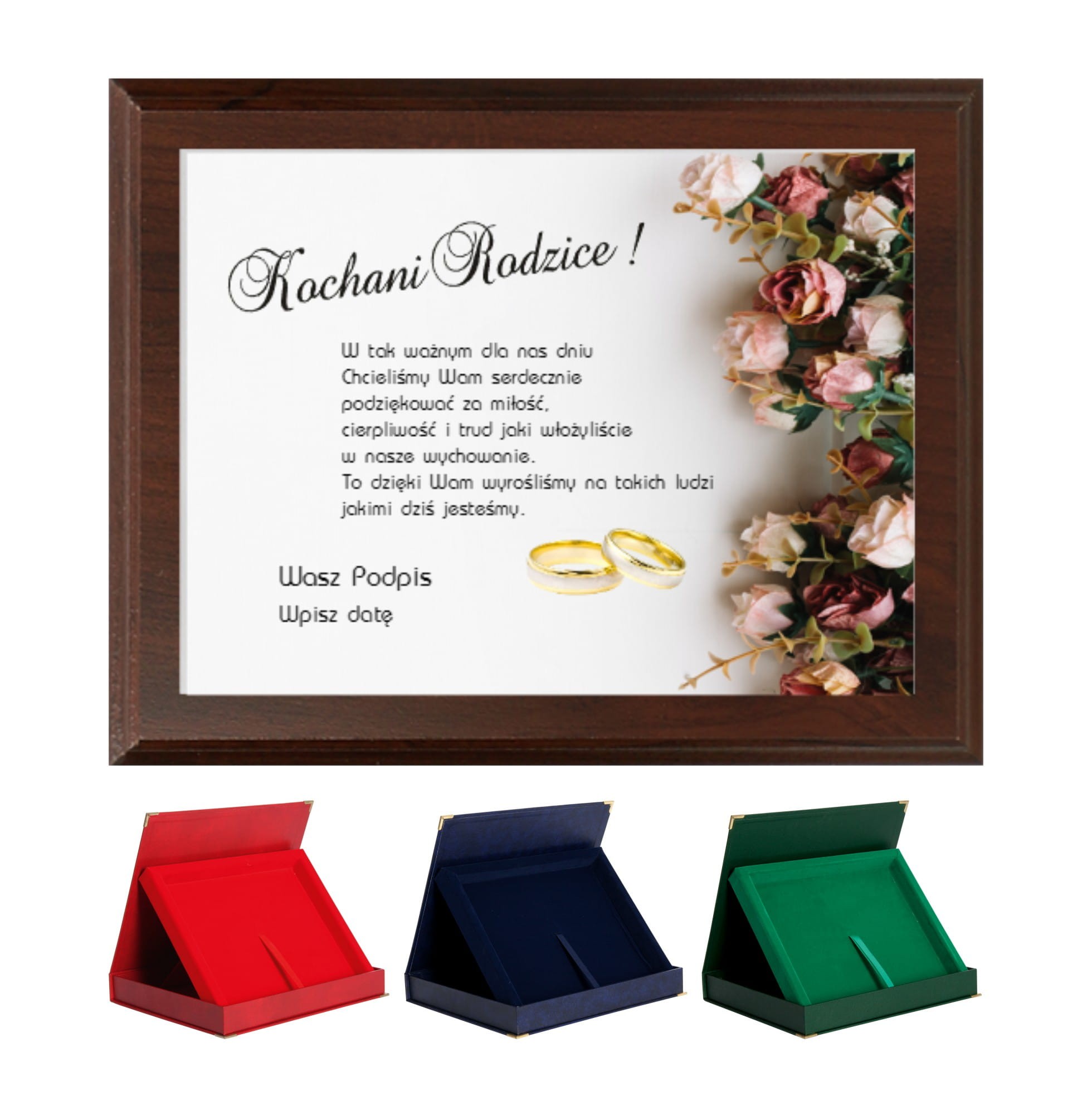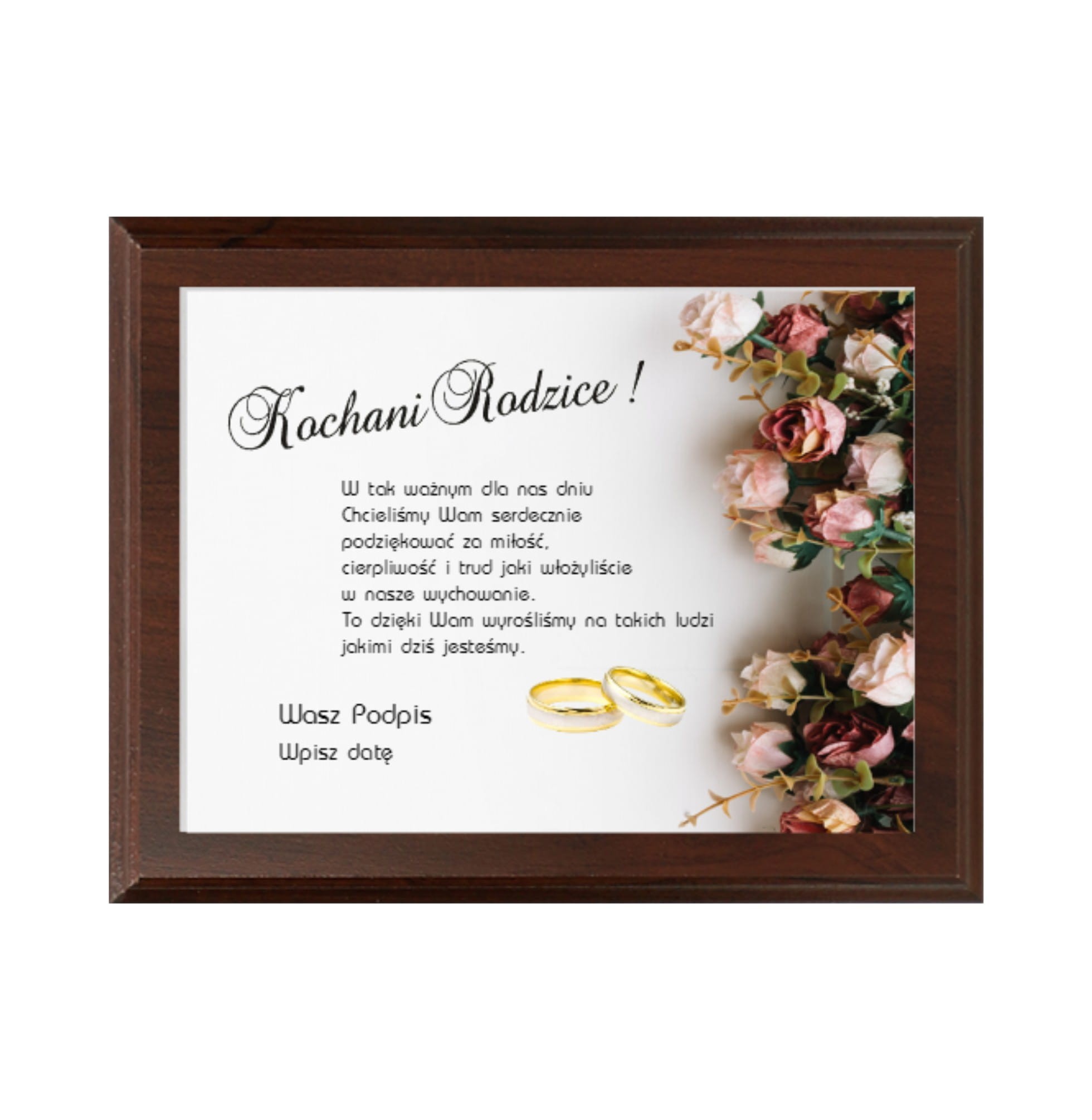 Prezentowany drewniany dyplom z nadrukiem na blaszce to wyjątkowy sposób na wyrażenie wdzięczności rodzicom od nowożeńców podczas ślubu. Wykonany z wysokiej jakości drewna, wyróżnia się trwałością i estetyką. Ten dyplom to piękna forma wyrażenia wdzięczności za miłość, troskę i wsparcie rodziców, które towarzyszyły nowożeńcom przez całe życie.