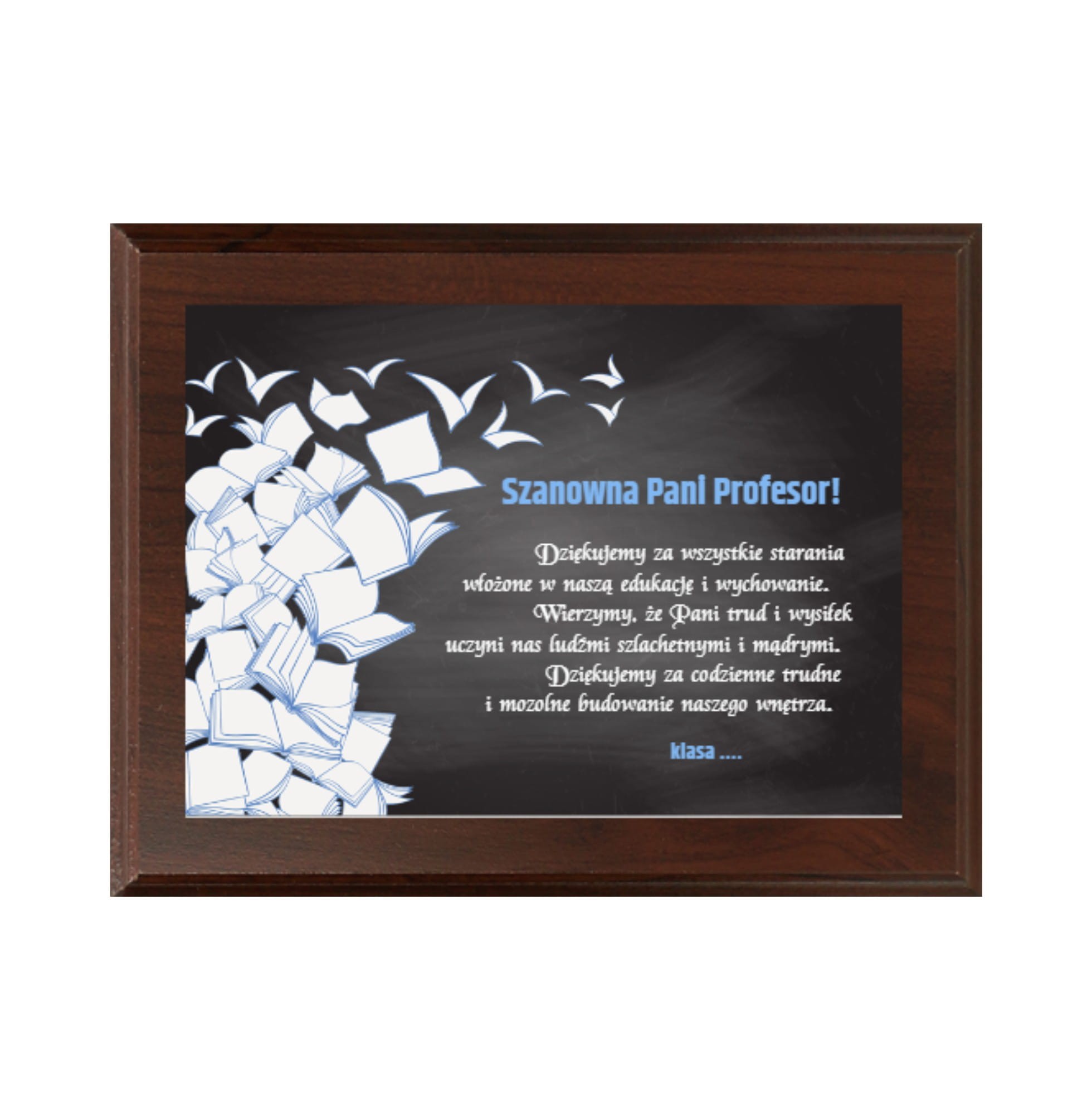 Prezentowany drewniany dyplom z nadrukiem na blaszce to wyjątkowy sposób na wyrażenie wdzięczności dla nauczyciela z okazji Dnia Nauczyciela. Wykonany z wysokiej jakości drewna, wyróżnia się trwałością i estetyką. Nadruk na blaszce przedstawia symboliczny motyw książek zamieniających się w ptaki, co pięknie obrazuje przekazywanie wiedzy i inspirowanie uczniów do rozwijania skrzydeł. Ten dyplom to wyjątkowa pamiątka, która w symboliczny sposób oddaje szacunek i wdzięczność za trud, pasję i zaangażowanie nauczyciela w kształtowanie młodych umysłów.