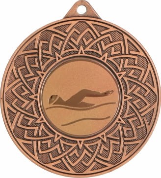 Medal metalowy ozdobiony klasycznym wzorem w formie rozety otaczającym centralny emblemat z motywem pływania. Taki emblemat symbolizuje wytrwałość, dynamikę i doskonałość techniczną, fundamentalne cechy tej dyscypliny sportowej. Pływanie wymaga siły fizycznej, precyzyjnej techniki oraz umiejętności pokonywania własnych ograniczeń. Medal dostępny jest w trzech klasycznych wersjach kolorystycznych: złotej, srebrnej i brązowej, co umożliwia dopasowanie go do odpowiedniego poziomu wyróżnienia. Dodatkowo, istnieje także opcja personalizacji poprzez dodanie grawera lub nadruku na tył medalu, dzięki czemu zyska on indywidualny charakter i stanie się wyjątkową pamiątką. Taka nagroda to doskonałe wyróżnienie na zawody pływackie, mistrzostwa szkolne, turnieje klubowe oraz imprezy promujące sporty wodne i aktywność fizyczną. Medal ten uhonoruje zawodników za ich szybkość, wytrwałość i wyjątkowe umiejętności, będąc symbolem każdego ustanowionego rekordu i zdobytego podium na basenie.
