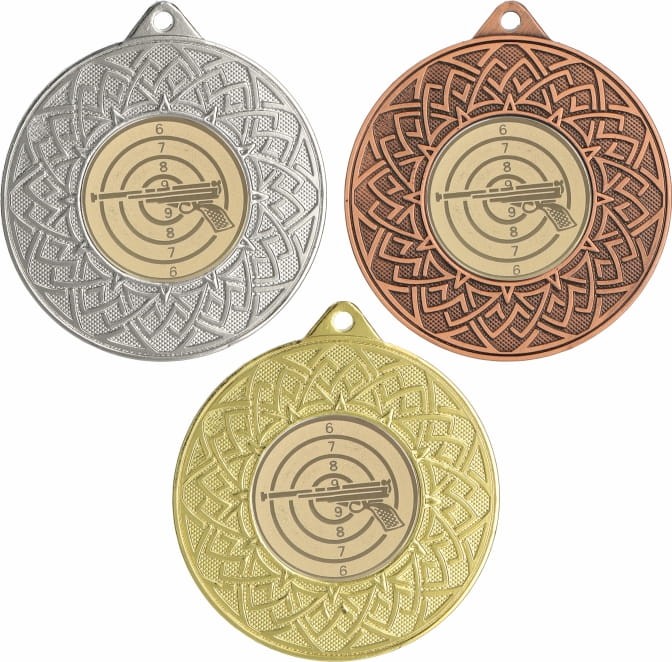Prezentowany medal wykonany został z wysokiej jakości metalu i ozdobiony klasycznym wzorem w formie rozety otaczającym emblemat z motywem strzelectwa. Taki emblemat, z wizerunkiem broni krótkiej na tle tarczy symbolizuje precyzję, skupienie oraz umiejętność panowania nad emocjami, kluczowe cechy dla tej wymagającej dyscypliny sportowej. Strzelectwo wymaga od zawodników nie tylko doskonałej techniki,, ale również wyjątkowej koncentracji i stabilności. Medal dostępny jest w trzech klasycznych wersjach kolorystycznych: złotej, srebrnej i brązowej, co umożliwia dopasowanie go do osiągniętego poziomu wyróżnienia. Dodatkowo, istnieje również dodatkowa opcja personalizacji poprzez dodanie grawera lub nadruku, dzięki czemu medal zyska indywidualny charakter i stanie się wyjątkową pamiątką. Taka nagroda to doskonałe wyróżnienie na zawody strzeleckie, mistrzostwa klubowe, turnieje strzelectwa precyzyjnego oraz inne imprezy promujące tę dyscyplinę sportową. Medal uhonoruje zawodników za ich celność, opanowanie oraz techniczne umiejętności, będąc symbolem każdego trafionego punktu i zdobytego miejsca na podium.
