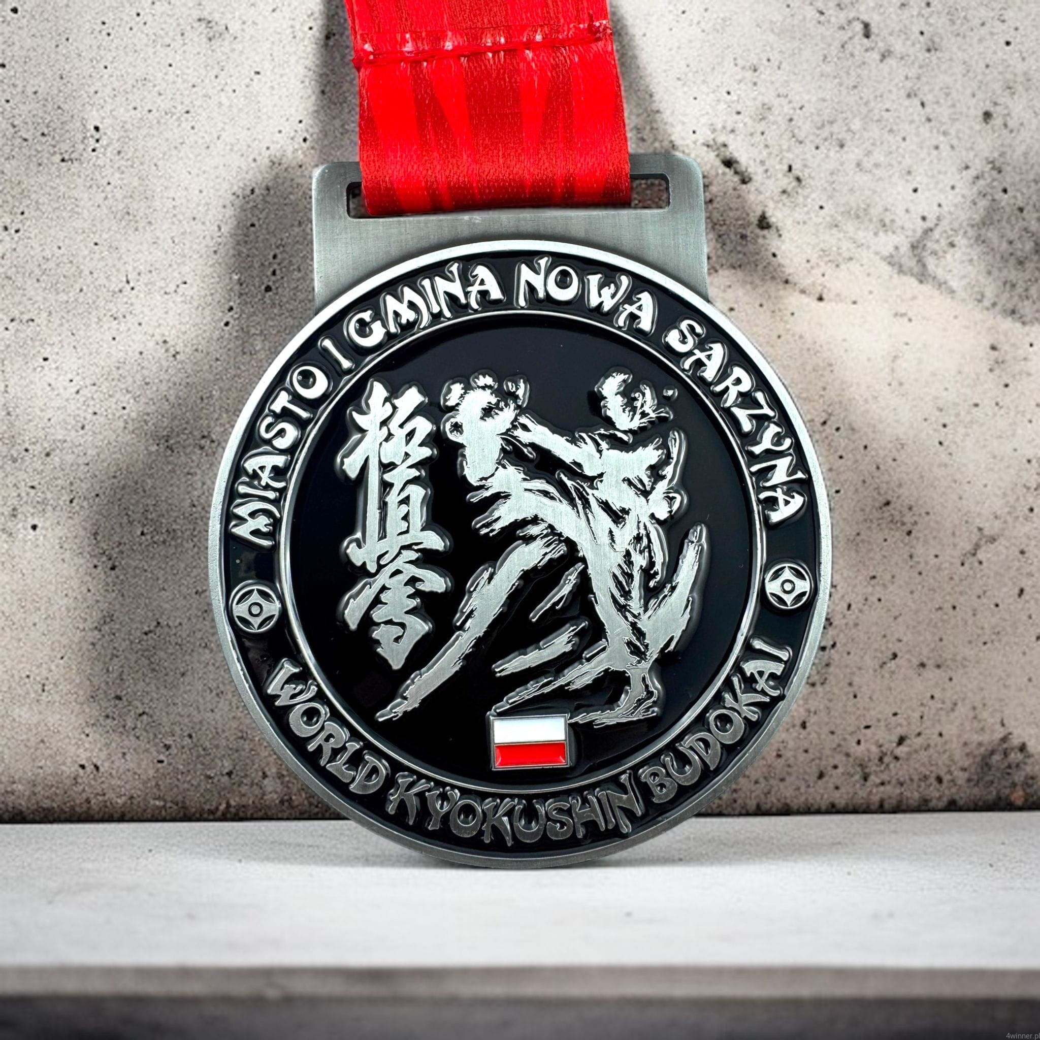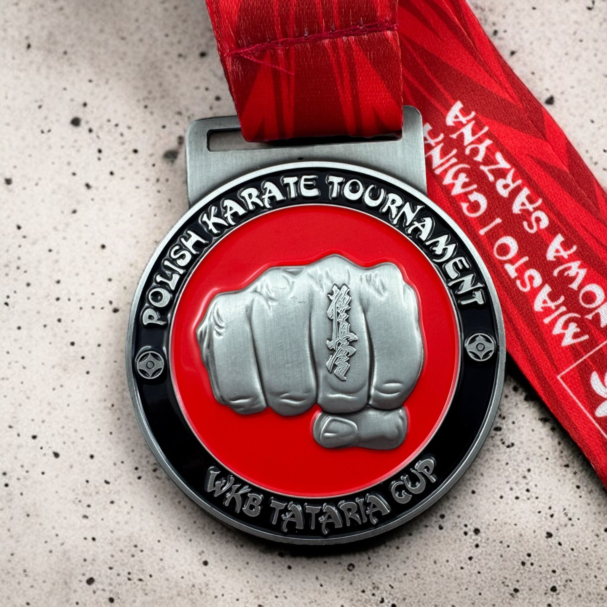 Prezentowany medal odlewany stworzony został z okazji zawodów karate i w symboliczny sposób oddaje ducha tej sztuki walki. Centralnym elementem projektu jest mocno zaciśnięta pięść - znak siły, determinacji i nieustępliwości, jakie towarzyszą każdemu zawodnikowi na drodze do mistrzostwa.