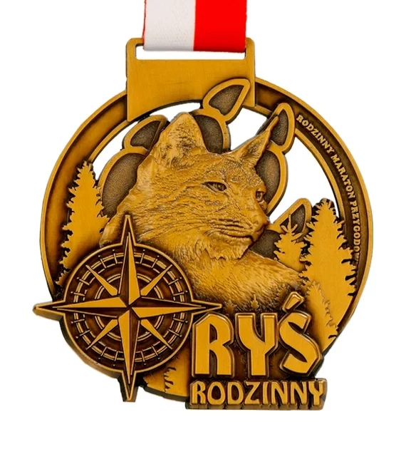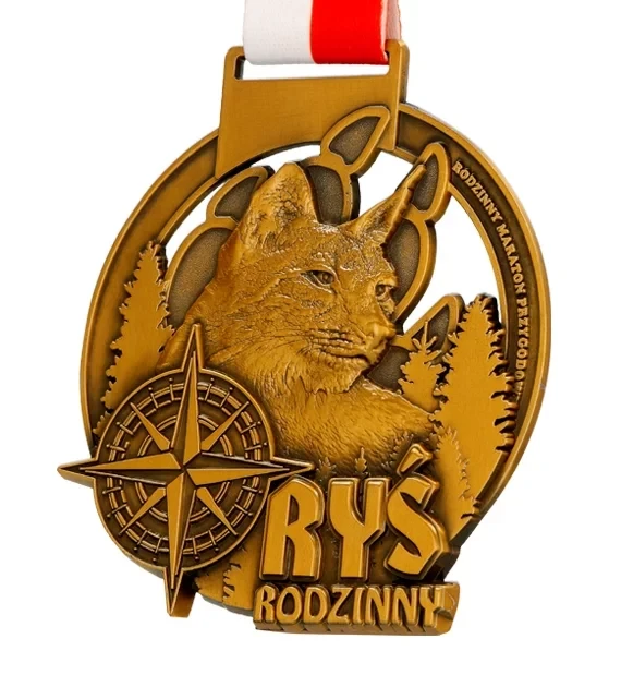 Prezentowany medal odlewany, stworzony został z myślą o maratonie rodzinnym, przedstawia sylwetkę rysia - zwierzęcia majestatycznego, czujnego i pełnego siły. Ryś, jako opiekun lasu i uosobienie naturalnej gracji, doskonale oddaje ideę biegu, który łączy pokolenia i w którym nie liczy się wynik, a wspólna droga.