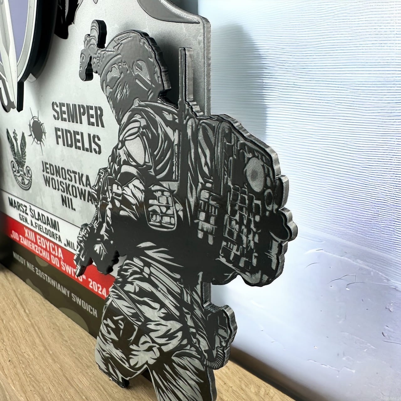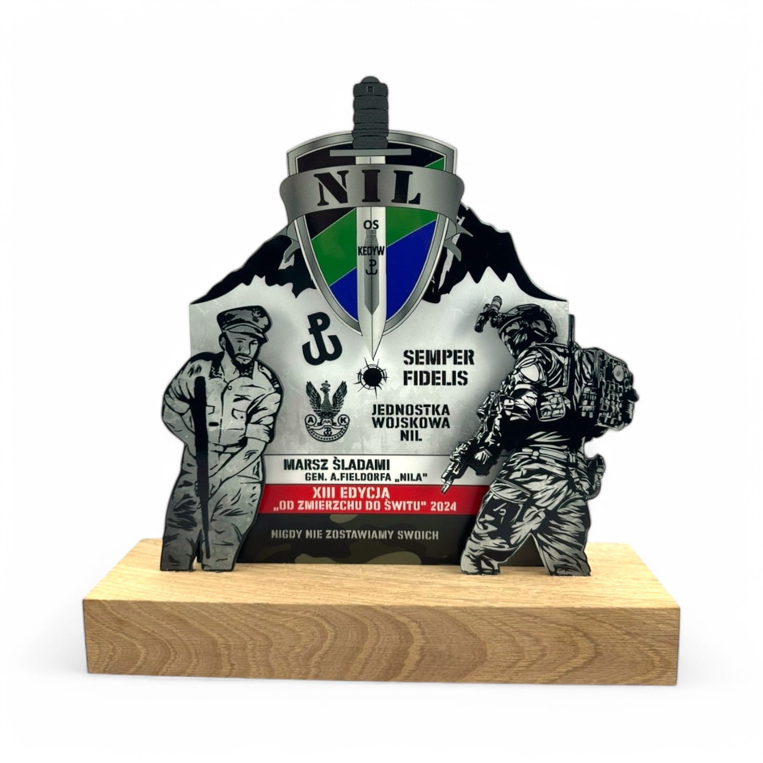 Prezentowana statuetka została zaprojektowana z myślą o uczczeniu marszu organizowanego przez Jednostkę Wojskową NIL. Wykonana z trwałego, precyzyjnie wycinanego metalu i osadzona na solidnym drewnianym postumencie, który podkreśla jej podniosły, pamiątkowy charakter. Połączenie metalu i naturalnego drewna tworzy elegancką kompozycję symboliczną - siła i wytrwałość zakorzeniona w wartościach tradycji.