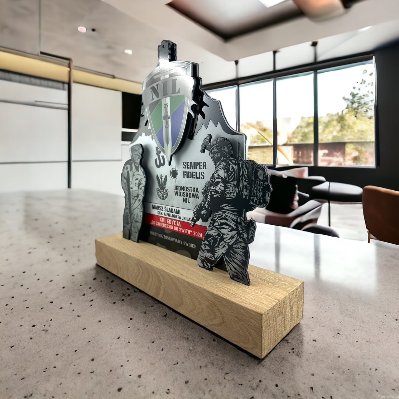 Centralnym elementem statuetki jest herb Jednostki Wojskowej NIL, umieszczony w górnej części konstrukcji. Całość ozdobiona została drukiem UV, nadającym statuetce intensywnych barw. W dolnej części, znajdują się realistyczne odwzorowane sylwetki żołnierzy, symbolizujące braterstwo, wytrwałość i gotowość do działania. To nie tylko estetyczny wyróżnik, ale również symbol odwagi, lojalności i służby, który z dumą może być wręczany jako znak uznania i wdzięczności dla tych, którzy wypełniają swoją misję z honorem.