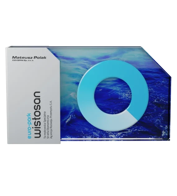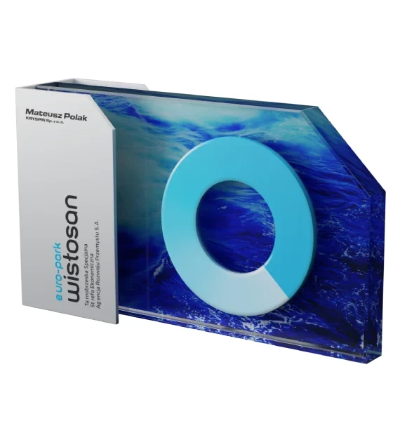 Na szklanej części statuetki został wykonany nadruk wody - delikatny, artystyczny motyw przedstawiający fale. Grafika ta symbolizuje nieustanny ruch i zdolność adaptacji - cechy niezwykle istotne w biznesie. Metalowy element, który stanowi kontrastowe uzupełnienie, pełni funkcje nośnika dedykacji. Całość może zostać dodatkowo spersonalizowana zgodnie z życzeniem zamawiającego. To wyjątkowe trofeum o nowoczesnym charakterze, które łączy estetykę i przesłanie. Dzięki zastosowaniu szkła i metalu oraz subtelnemu motywowi wody, doskonale wpisuje się w klimat firmowych uroczystości, podkreślając profesjonalizm i otwartość na zmiany.
