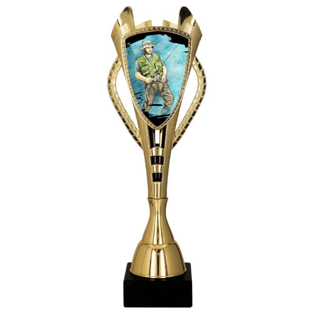 Prezentowany złoty puchar, wykonany z plastiku, zachwyca szczegółowym wykonaniem i elegancją, które nadają mu charakteru. Złoty kolor trofeum, efektowanie odbija światło, sprawiając, że trofeum przyciąga uwagę i staje się wyrazistym symbolem osiągnięć. W centralnym miejscu na pucharze znajduje się tabliczka z nadrukiem, na której przedstawiony został wizerunek wędkarza. Nadruk symbolizuje cierpliwość jak i spokój, niezbędne do osiągnięcia mistrzostwa w tej dziedzinie, jak i radość z bliskości natury, będącej nieodłącznym elementem wędkarstwa. Podstawa wykonana z marmuru, dodaje całości wyjątkowej elegancji oraz stanowi solidne fundamenty dla trofeum.