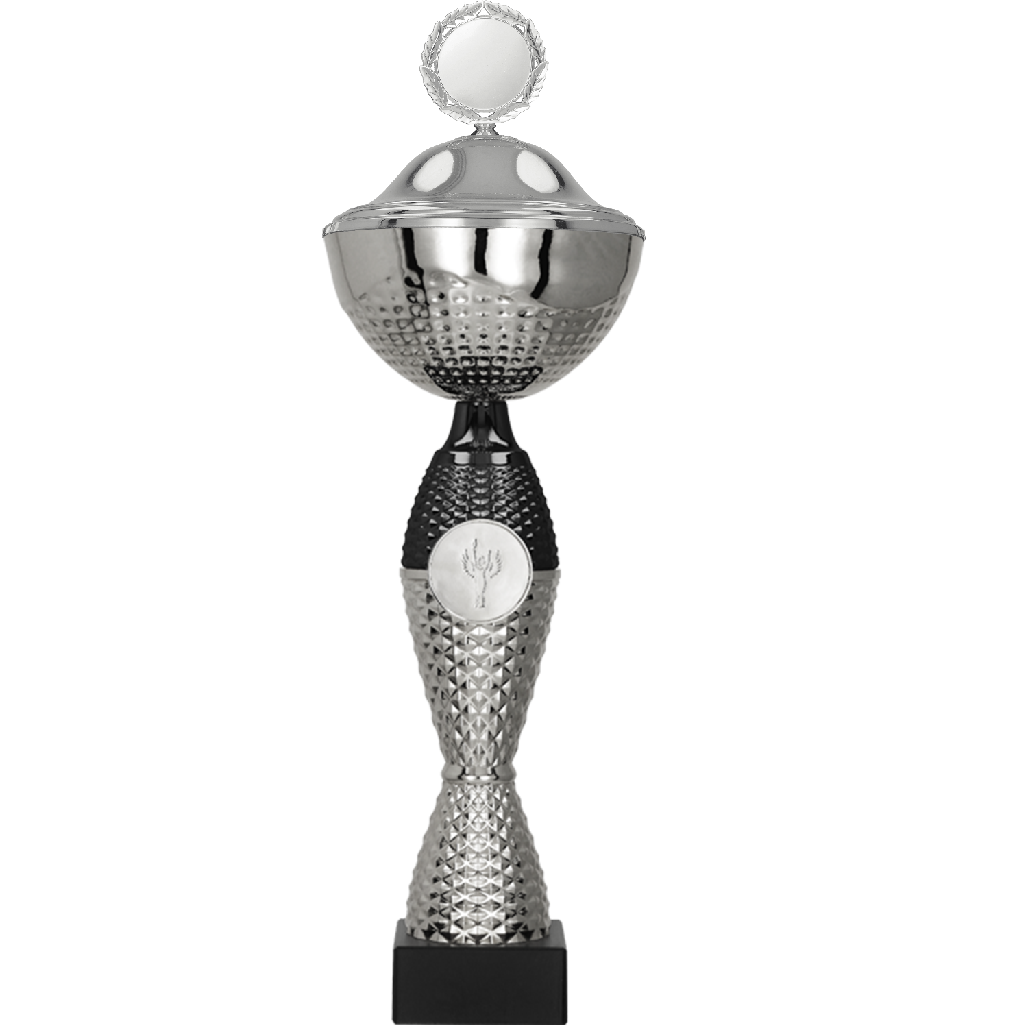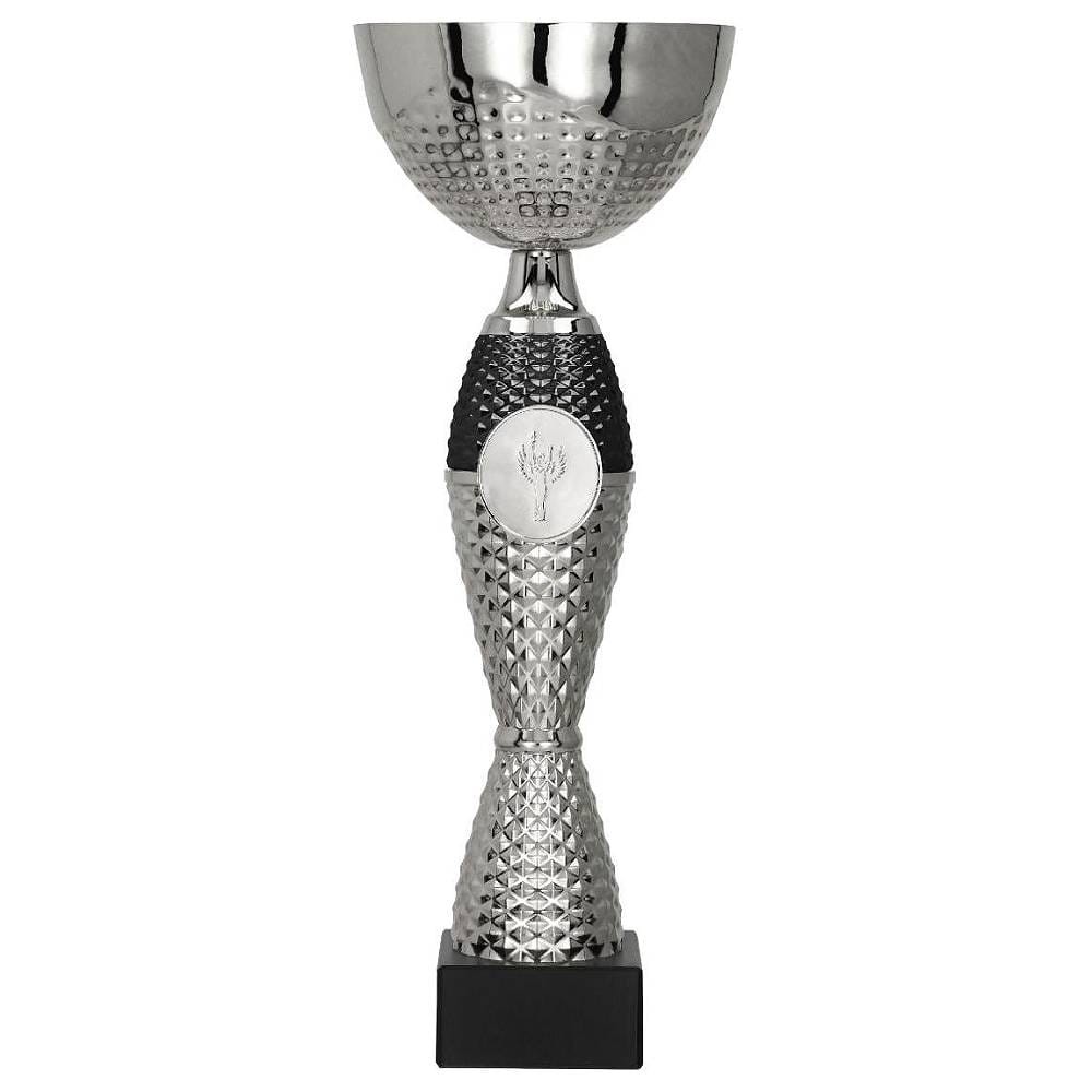 Prezentowany puchar o smukłym i wydłużonym kształcie, zakończony został tradycyjnym kielichem na górze, który nadaje eleganckiego i szlachetnego wyglądu. Całość powierzchni od spodu kielicha aż po całą stopkę pokryta została pikowanymi zdobieniami, które dodają całości unikalnego charakteru i sprawiają, że jest nie tylko trofeum, ale również dziełem sztuki. Stopka pucharu wykonana w kolorze srebrnym, jest wykończona czarną górą, co tworzy kontrastową i zjawiskową całość. Na środku stopki znajduje się miejsce na emblemat, który oferuje możliwość personalizacji. Całość konstrukcji umieszczono na trwałym marmurowym postumencie.