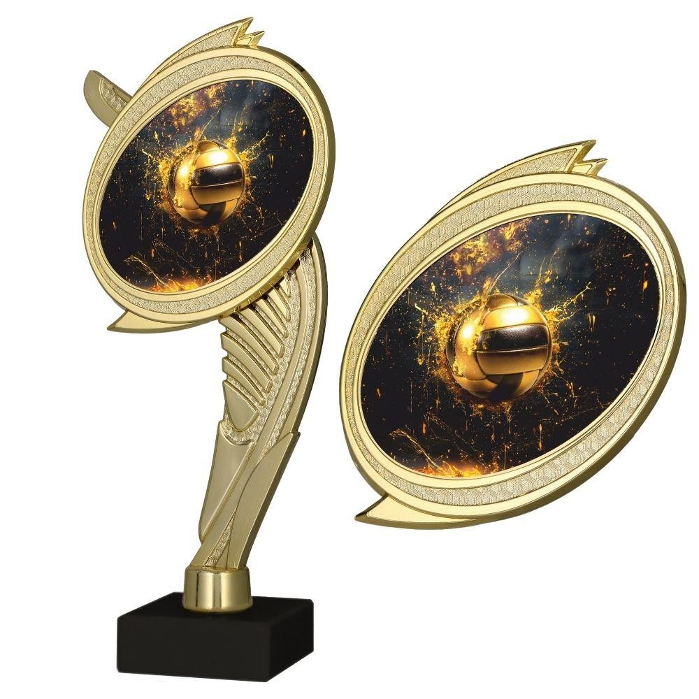 Prezentowana statuetka z motywem siatkówki to nowoczesne wyróżnienie, które w efektowny sposób podkreśla dynamikę, lekkość i zespołowy charakter tej widowiskowej dyscypliny sportu. Nagroda przyjmuje formę pojedynczego, smukłego skrzydła, na którego górnej części umieszczono okrągły dysk z nadrukiem przedstawiającym motyw siatkówki, który jednoznacznie nawiązuje do dyscypliny i nadaje nagrodzie sportowego charakteru. Lśniące, złote wykończenie nadaje prestiżu i efektownie odbija światło, przyciągając uwagę.