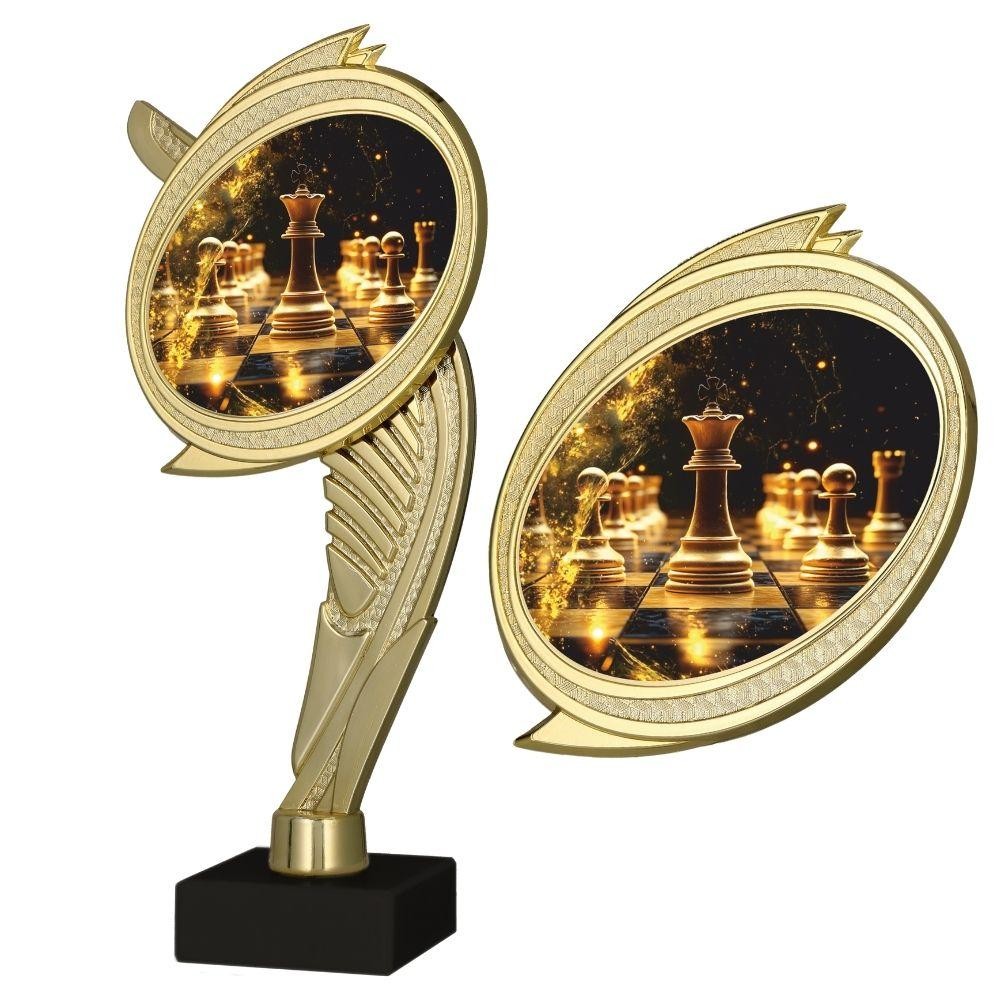 Prezentowana statuetka z motywem szachów to elegancka i symboliczna forma wyróżnienia, która w wyjątkowy sposób łączy intelekt, strategię oraz dążenie do perfekcji. Nagroda przyjmuje formę pojedynczego, smukłego skrzydła, które symbolizuje rozwój oraz przekraczanie kolejnych poziomów umiejętności. Na szczycie umieszczono okrągły dysk z nadrukiem przedstawiającym motyw szachowy, dzięki czemu trofeum jednoznacznie nawiązuje do królewskiej gry. Zastosowane złote, lśniące wykończenie podkreśla prestiż nagrody i nadaje jej wyjątkowo elegancki charakter.