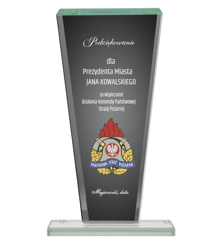 Prezentowana smukła szklana statuetka to wyjątkowy symbol uznania, idealny zarówno jako nagroda dla strażaka i służb mundurowych, jak i wyróżnienie w różnorodnych konkursach. Wykonana z najwyższej jakości szkła oraz umieszczona na stabilnej podstawie, emanuje elegancją i nowoczesnością. Trofeum jest trafionym wyborem jako nagroda za wyjątkową służbę dla strażaków i członków innych służb mundurowych, zarówno czynnych, jak i emerytowanych, oraz jako wyróżnienie za wybitne osiągnięcia w różnych dyscyplinach sportowych i konkursach. Alternatywą dla szklanej statuetki są: statuetki akrylowe, odlewane lub metalowe.