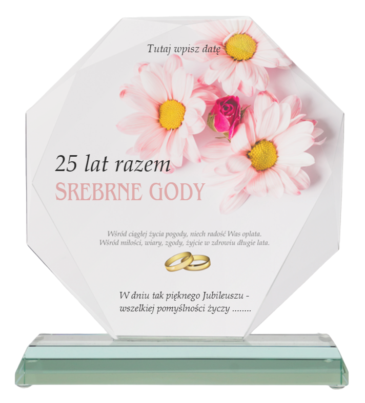 Szklana, smukła statuetka z dedykacją na srebrne gody to elegancki i pełen wdzięku symbol 25- letniego wspólnego życia. Wykonana z przejrzystego, wysokiej jakości szkła, poprzez swój subtelny kształt podkreśla wyjątkowość tego ważnego jubileuszu.