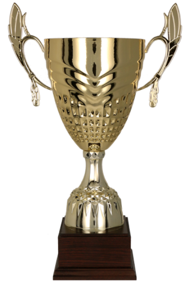 to eleganckie trofeum z bogatym kielichem, ozdobionym efektownymi przetłoczeniami. Puchar wyróżnia się również strzelistymi, złotymi uchwytami oraz prestiżowym drewnianym postumentem, które dodają mu klasy i wyjątkowego charakteru.