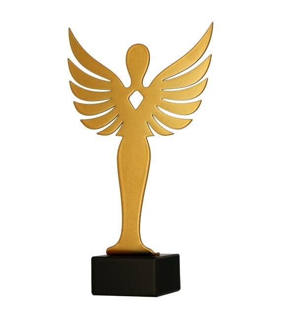 Prezentowana statuetka to majestatyczna forma nagrody, przedstawiająca skrzydlatą postać bogini zwycięstwa - Wiktorii. Metalowa forma w złotym wykończeniu lśni w świetle, podkreślając prestiż i wyjątkowość nagrody. Całość osadzona została na podstawie z czarnego marmuru, co tworzy elegancki kontrast i dodaje statuetce monumentalnego charakteru.
