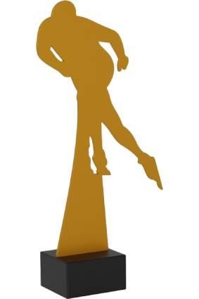 Prezentowana statuetka to efektowne trofeum sportowe, które przedstawia zawodnika w charakterystycznej pozie z wyraźnie zaznaczonym ruchem jazdy. Postać uchwycona została w pełnej koncentracji i napięcia ciała, co oddaje esencję łyżwiarskiej techniki, szybkości i kontroli. Wykonana została z metalu i osadzona na masywnej podstawie z czarnego marmuru, podkreślając tym rangę nagrody.