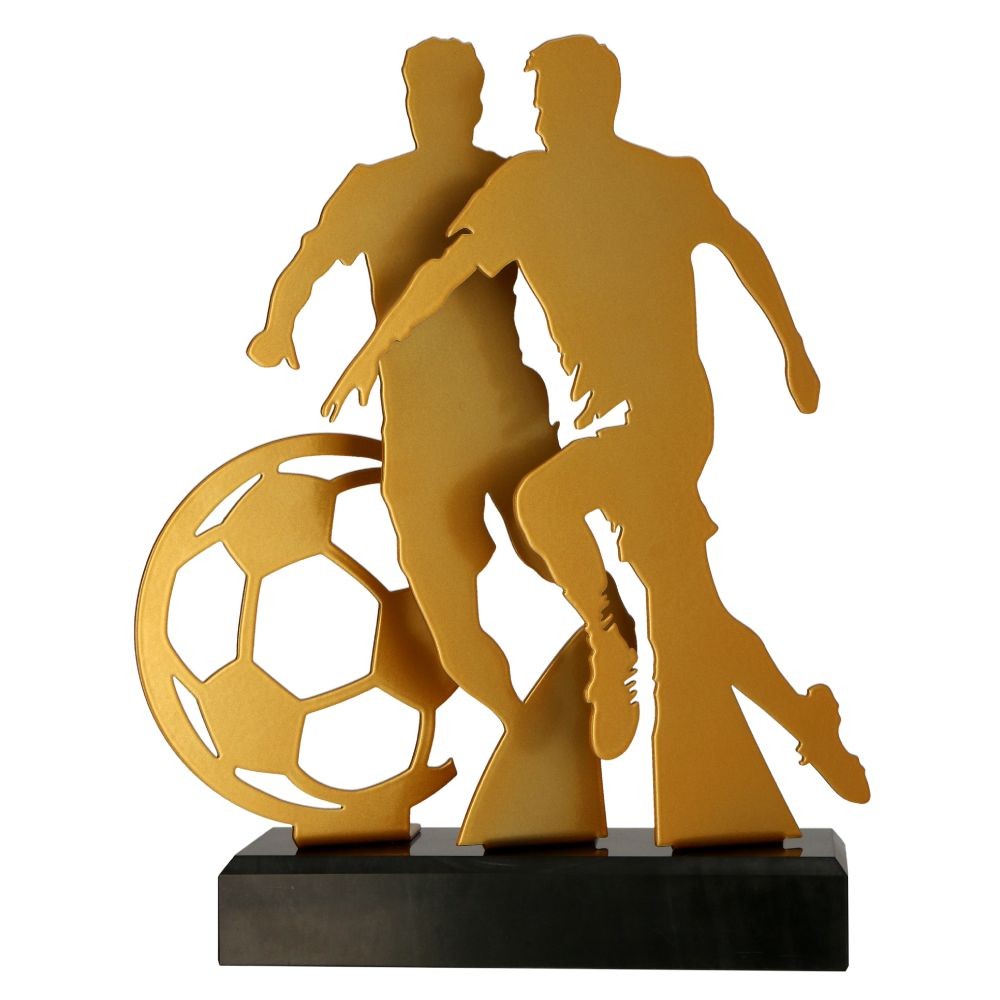 Prezentowana złota statuetka przedstawiająca piłkę nożną, wykonana została z metalu i stanowi wyraz uznania dla pasji, zaangażowania i sportowego ducha, które są nieodłącznymi cechami tej popularnej dyscypliny. Wykonana z dbałością o detale, statuetka przedstawia dwóch piłkarzy w dynamicznej pozie, uchwyconych podczas rywalizacji na boisku, a za nimi dużą piłkę do gry. Trofeum osadzone zostało na solidnej podstawie, symbolizując tym nie tylko emocje związane z piłką nożną, ale również wysiłek i osiągnięcia sportowe.