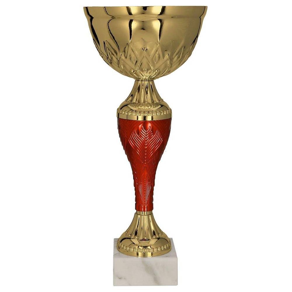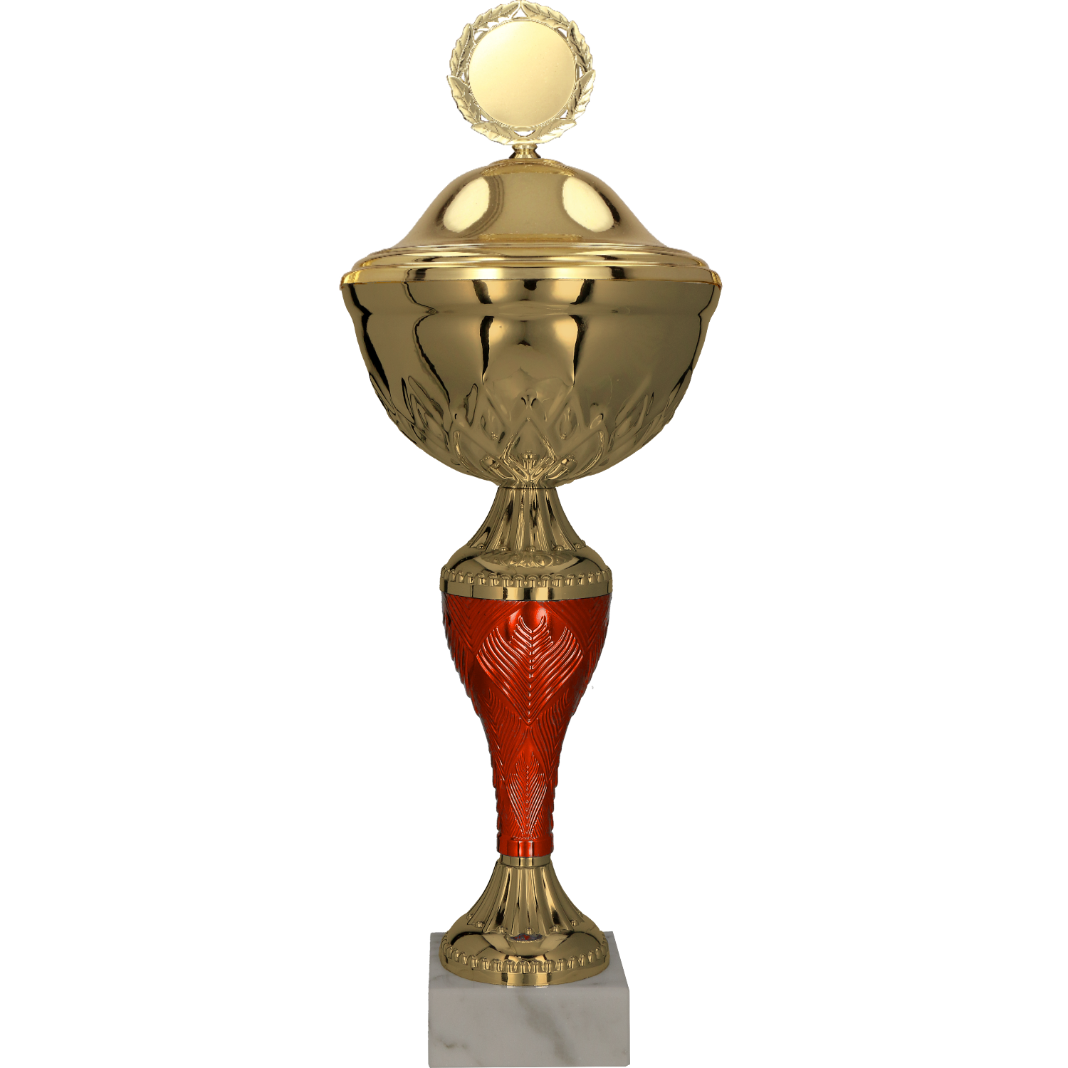 Prezentowany puchar charakteryzuje się klasycznym, metalowym kielichem, który został umieszczony na stopce o odcieniach złota i czerwieni, która nadaje mu niezwykłej elegancji oraz ciepła. Spód kielicha oraz stopka zostały ozdobione delikatnymi zdobieniami, które wprowadzają element rafinacji i wyjątkowości. Marmurowa podstawa zapewnia stabilność całej konstrukcji, a zarazem dodaje całości szlachetności i prestiżu.