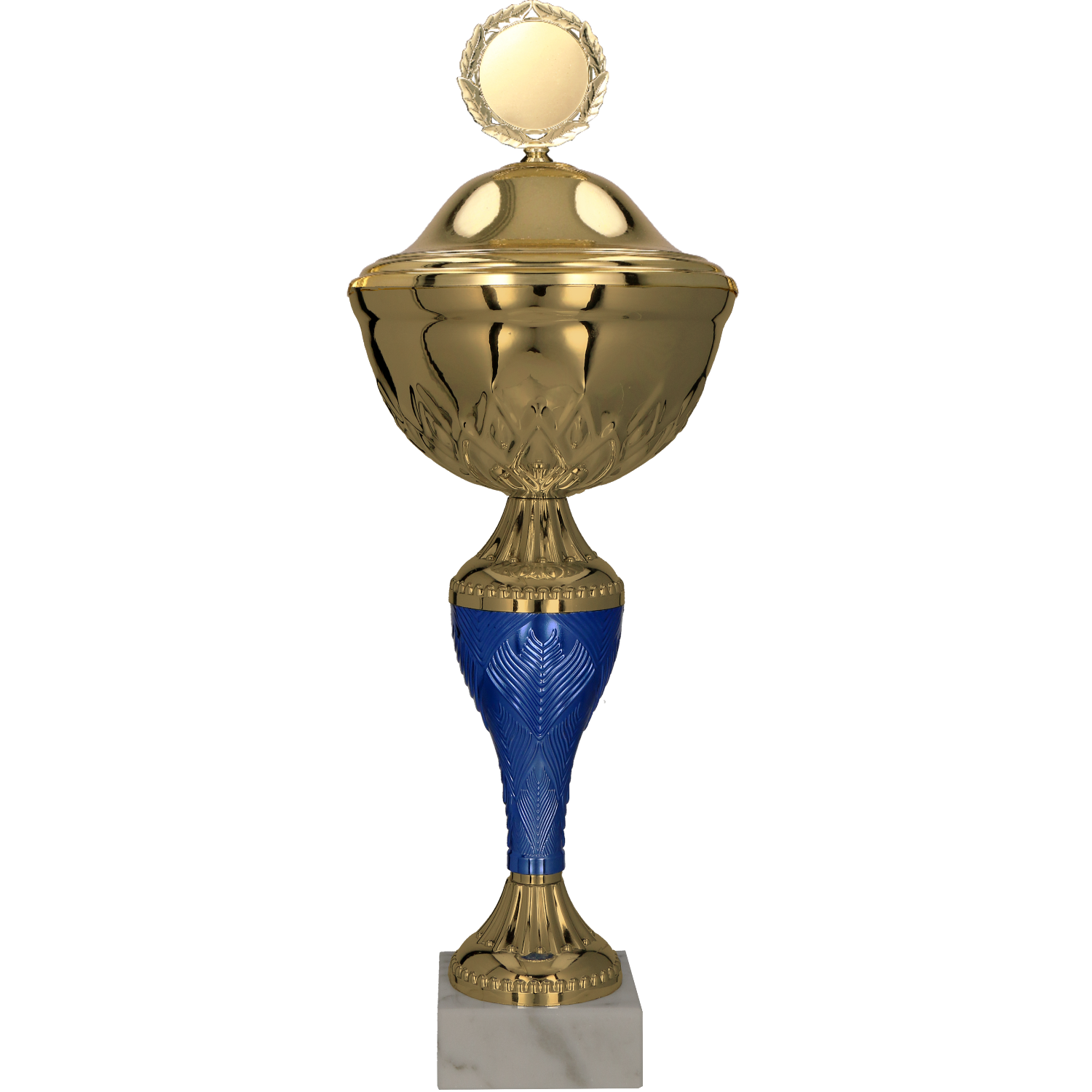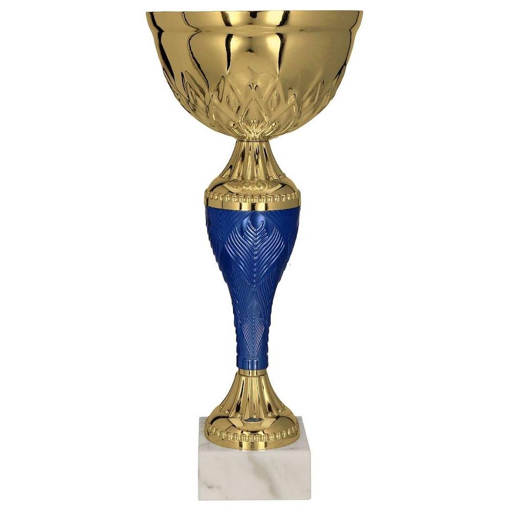 Ten złoty puchar, z klasycznym metalowym kielichem osadzonym na złoto-niebieskiej stopce, emanuje prestiżem i elegancją. Delikatne zdobienia na spodzie kielicha oraz na stopce nadają mu wyrafinowany charakter, podkreślając jego unikalność. Całość konstrukcji umieszczona została na jasnej marmurowej podstawie, która dodaje pucharowi dodatkowej stabilności oraz podnosi jego estetyczny walor.